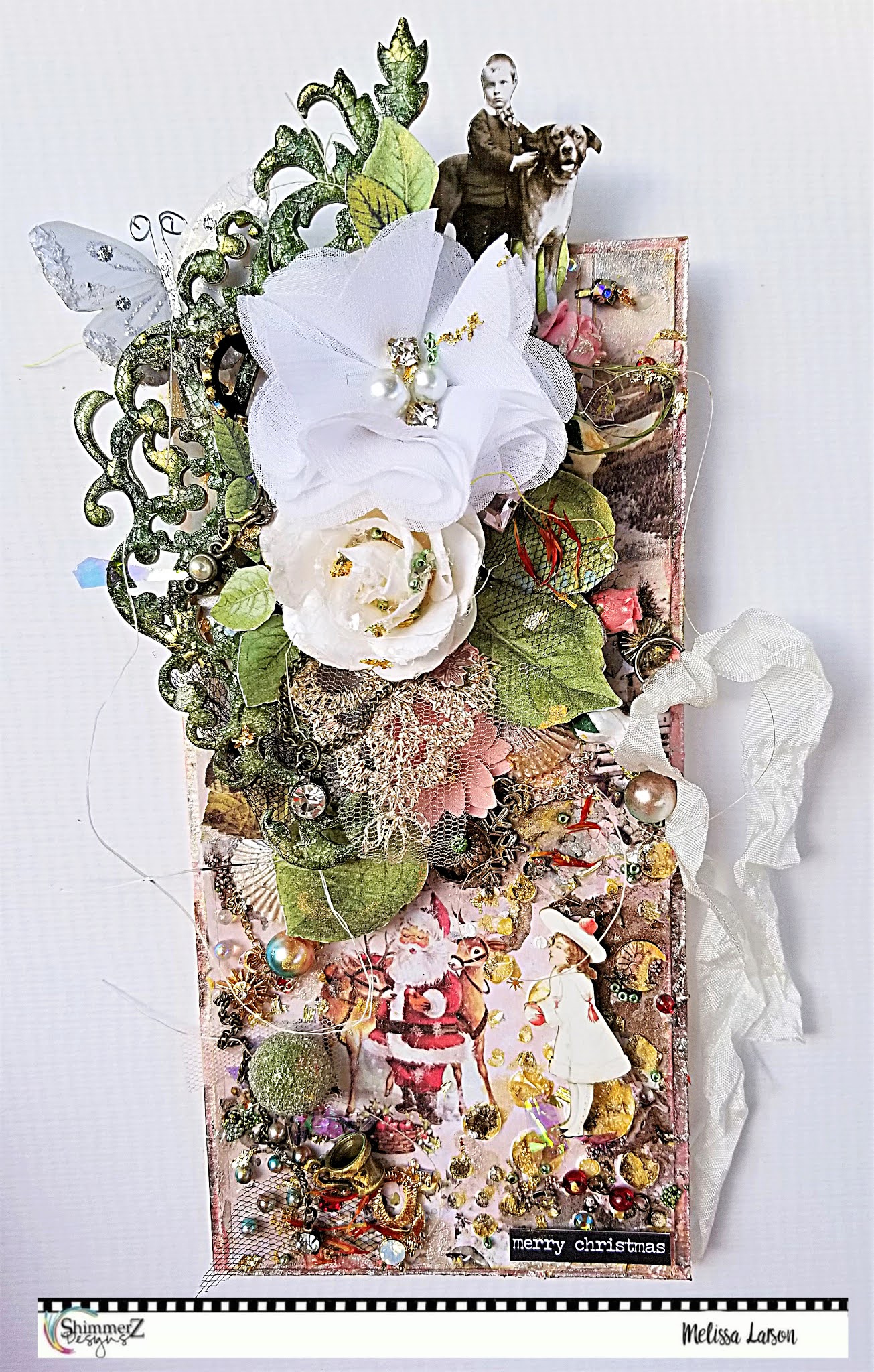 To add visual interest I glued on micro beads, seed beads,swarovski crystals,glass shard glitter,glass beads,pearls,iridescent wrapping paper,tulle,lace,pressed flowers and leaves,shells,fussy cut images from Prima and Graphic 45,flowers from Reneabouquets and Prima, metal from Reneabouquets,Prima,and Tim Holtz,and bling and metal from my stash.I rubbed and flicked on gold mica powder.
