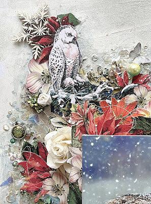 I coated a sheet of 49 and Market paper with white gesso, then applied Prima Platinum crackle paste with a stencil and a spatula.I arranged the Graphic 45 fussy cut papers and flowers around the page, then added the beads and other items.I brushed on Shimmerz Paints, and glued on more beads. I applied jaquard silver mica powder with my fingers on the outer two inches or so of the page, and also on a lot of textured items. On the rest, around the fussy cut images,I used Silver Bells Shimmerz, and Frosty Buns Inklingz.